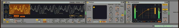 Dann gab es noch ein Pro­blem: Die­ser Flan­ger (Mit­te) ver­stärkt extrem bei bestimm­ten Ein­stel­lun­gen und über­steu­ert die Auf­zeich­nung. Abhil­fe schaff­te ein wei­te­rer Audio-Effekt »Compressor/Kneeless«, ein nicht­li­nea­rer Ver­stär­ker, so dass es auf die­ser Spur nie lau­ter wird als ‑3 dB, hier ganz rechts: