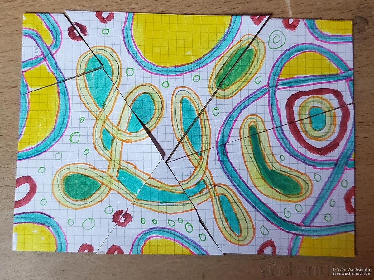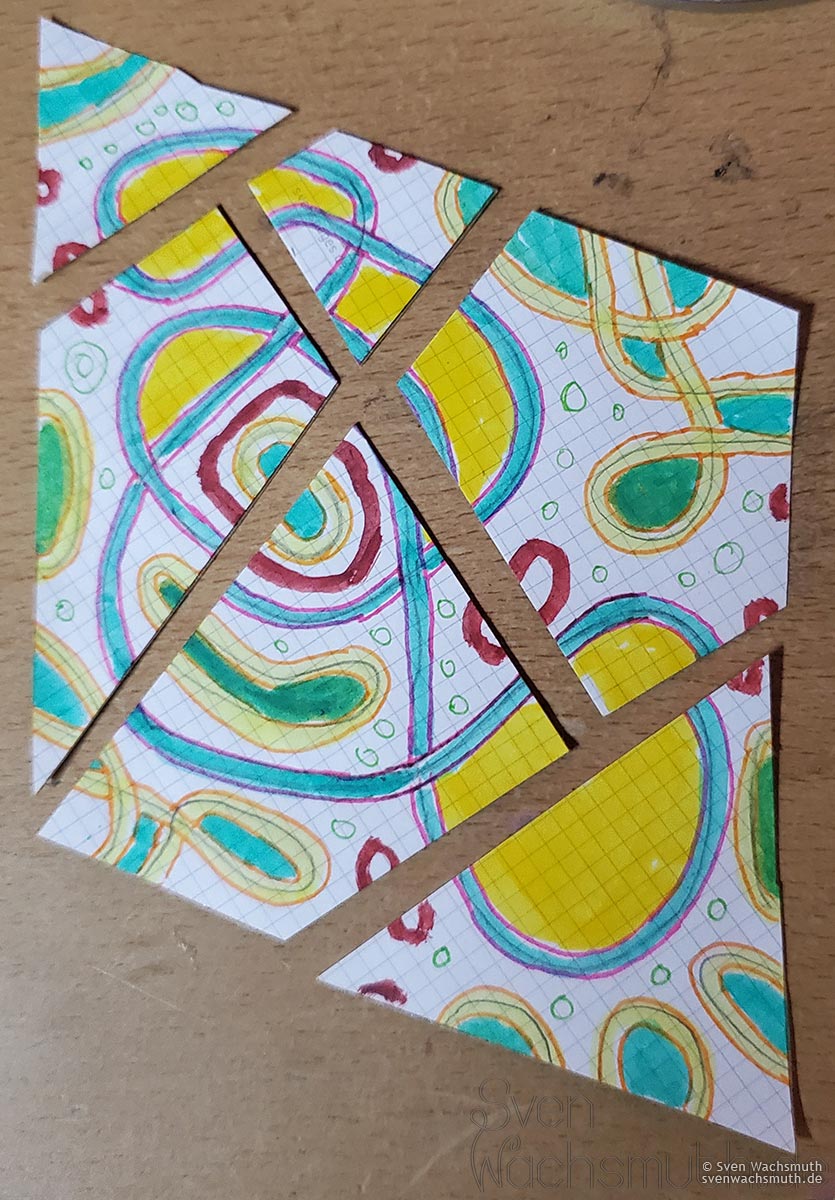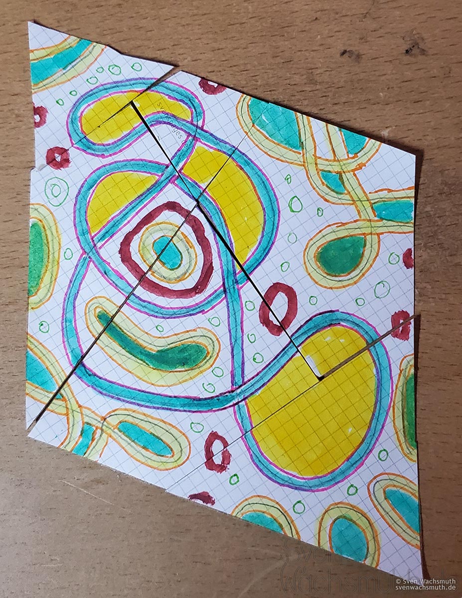 »Polygon-Doppelpuzzle«, Acryl auf Papier, Klebeband, 10,5 x 7 cm